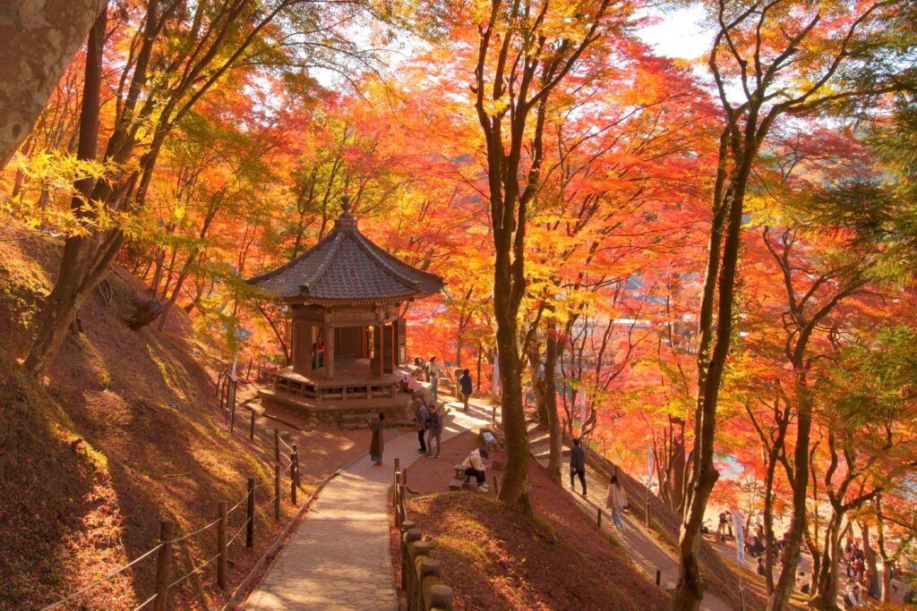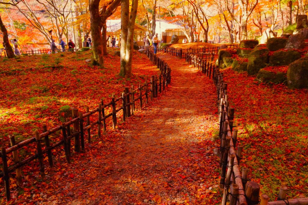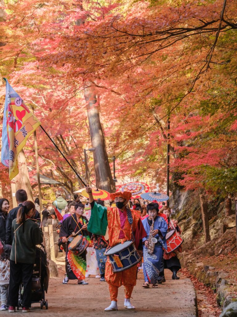 見頃を迎えた香嵐渓は道ゆく人々まで染め上げます。賑やかで楽しい雰囲気が伝わってきます。