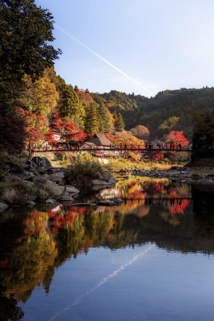 香嵐渓上流の香嵐橋周辺の景色です。橋と向こう側の茅葺屋根、もみじが一列に並び、それらが水鏡になっています。そこへ上手く飛行機が通り偶然性が加わっています。