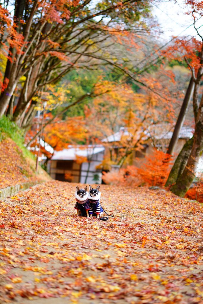 紅葉の絨毯の上で愛するワンちゃんのショット。もみじ絨毯での撮影は、人物ペットともとても映える写真になります。皆さんぜひやってみて!