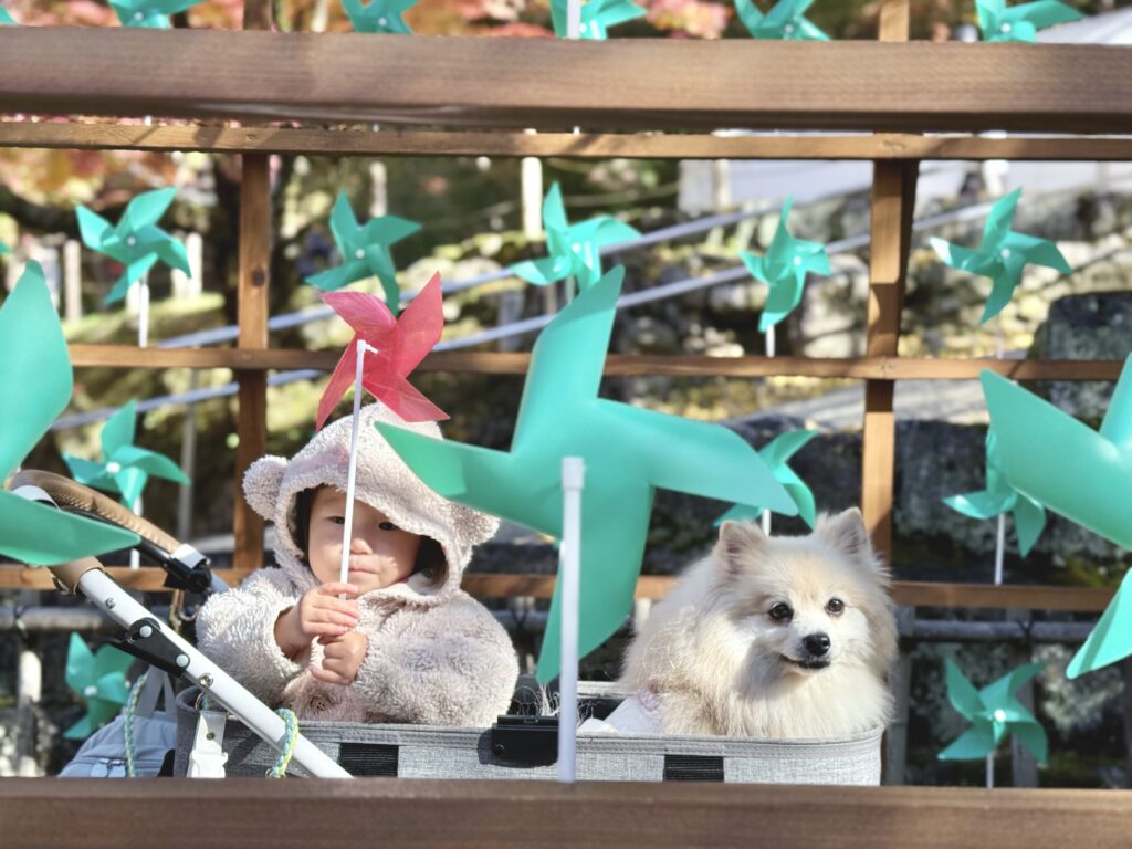 赤ちゃんとペットの仲睦まじいショット。新緑詣の風車の中で良い味が出ています。
