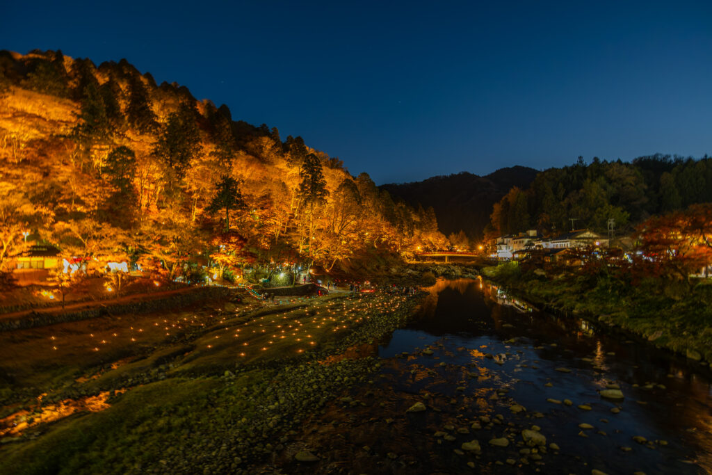 願掛けろうそくの写真です。広い画角を十分生かして香嵐渓全体を。空の色味も○